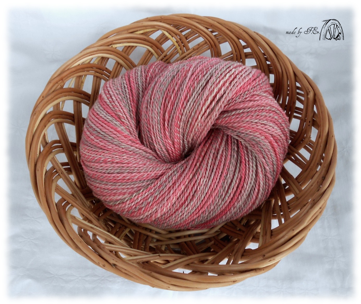 Egy 'bágyadt' színű fonal is lekerült a rokkámról. Saját festésű Rikker-féle finom merinó, kétágúra cérnázva. Vékonyka a szentem, de elég hosszú: 9,2 dkg, 610 m.